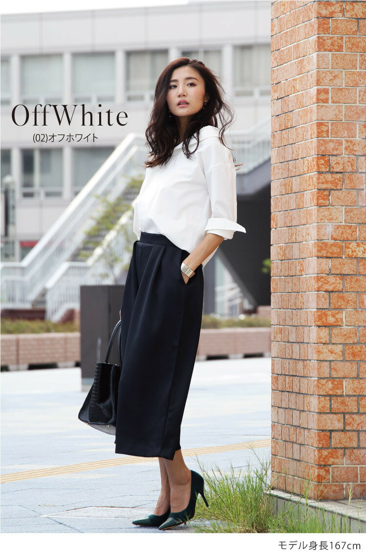 ボートネックのようなほどよい肌見せ感があるほんのり旬なデザイン。