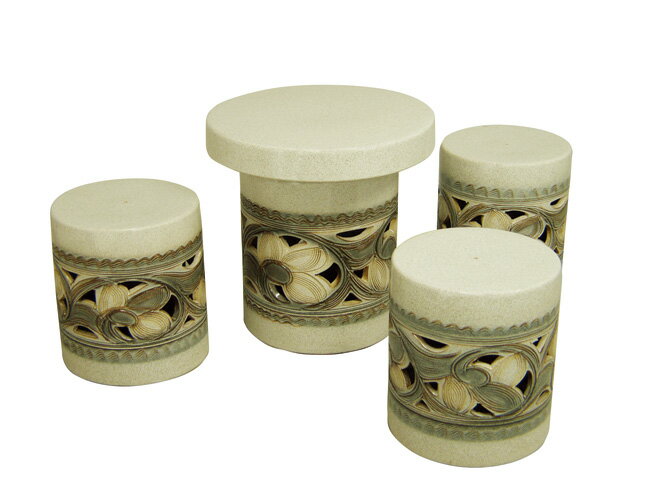 ▼信楽焼 テーブルセット カスミ唐草テーブルセット4点 15号 ▲カスミ唐草テーブルセット15号 スツール1点 ※信楽焼について 信楽は、日本六古窯の一つで1250年の伝統を誇る日本最古の産地です。