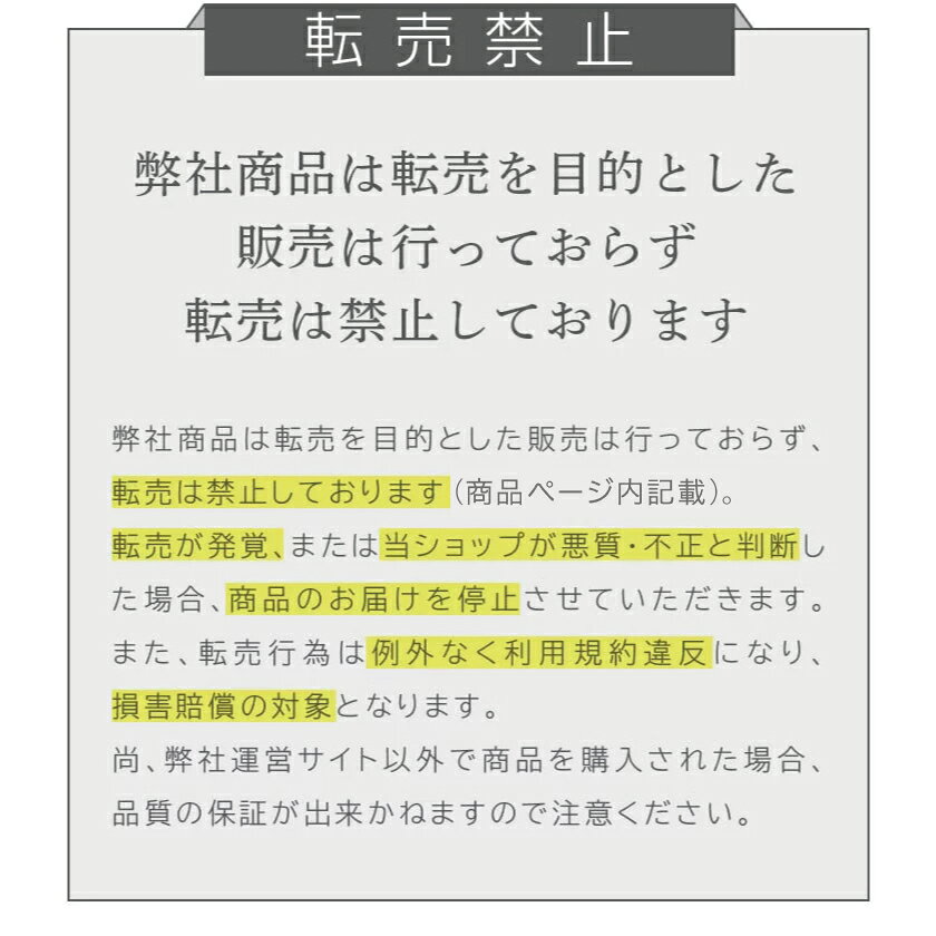 また、弊社商品は転売を目的とした販売は行っておらず、転売は禁止しております。